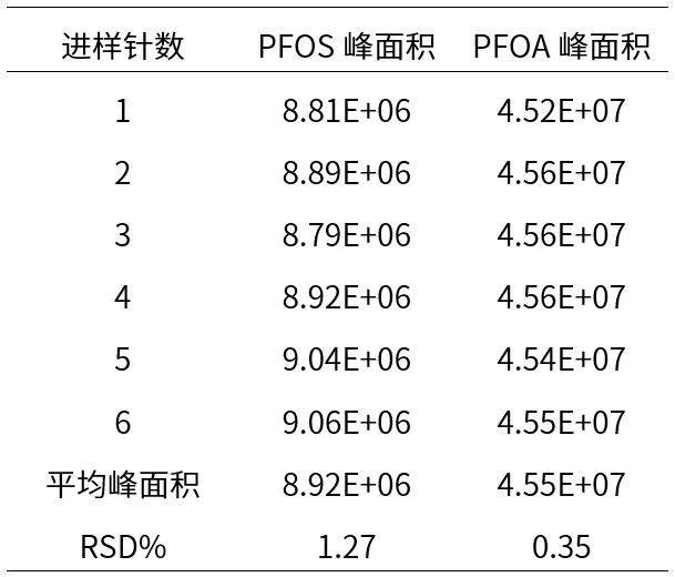 5 μg/L标准品溶液连续进样六针,结果表1所示,PFOS峰面积RSD为1.27%,PFOA峰面积RSD为0.35%,精密度良好。