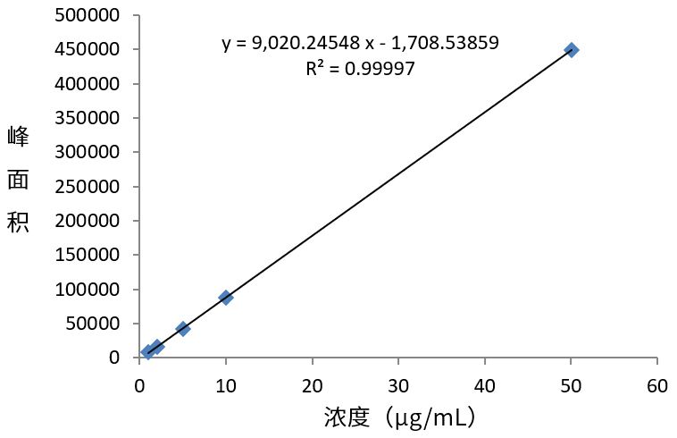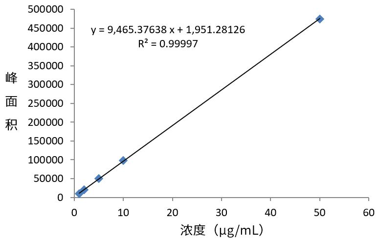 对系列浓度标准品(1-50 µg/mL)进行分析,能够得到良好线性结果如图2所示,定量限约为2.86 mg/Kg。