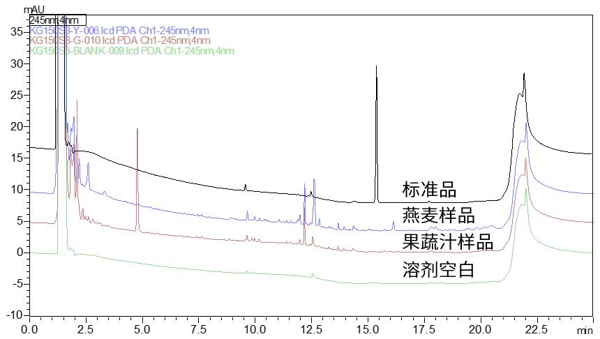 按照标准方法,对燕麦和果蔬汁样品进行前处理,获得结果如图6所示,样品中未检出明显抗坏血酸棕榈酸酯峰。