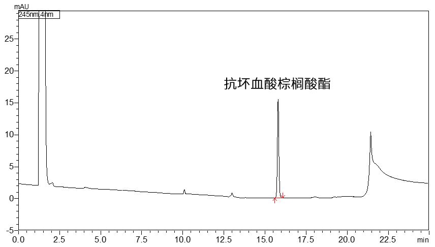 使用DAISOPAK SP-100-5-ODS-P色谱柱在该方法下进行了分析,结果如图4所示,抗坏血酸棕榈酸酯保留时间为15.88 min,不对称因子1.07,峰型良好,与标准图谱基本一致。