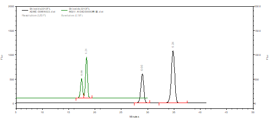 在常规C18体系下,CAPCELL PAK C18 MGIII可以得到较好的分离效果,而使用键合金刚烷基团的CAPCELL PAK ADME-HR(金刚烷键合)色谱柱,在相同液相条件下能得到更好的分离效果,分析结果如图1所示。