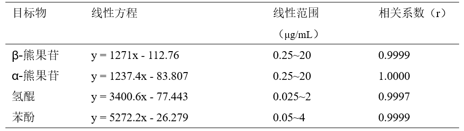 表4 α-熊果苷、β-熊果苷、氢醌和苯酚的线性方程、线性范围和相关系数