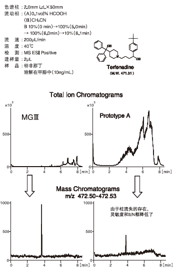 可以看出,来自色谱柱的流失物质不仅对质荷比相近的目标物离子有干扰作用,而且对目标成分的离子化效率也有负面影响。以特非那丁为样品对柱流失的影响进行了考察。