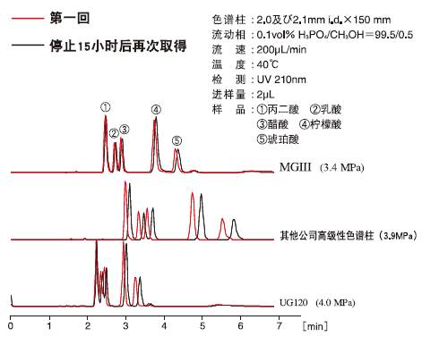 为了在酸性条件下对所有物质都能够得到再现性良好的数据,在CAPCELL PAK C18 MGⅢ填料的合成过程中,通过特殊的洗净方式和预处理将反应副产物和试剂带来的残留杂质彻底除去。