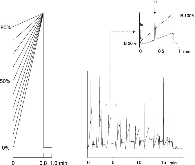 使用水相(A)和有机相(B)对MiniMini色谱柱进行高速梯度洗脱分析。将初始有机相比例从0%到90%,以10%为度进行10次1分钟的梯度洗脱。