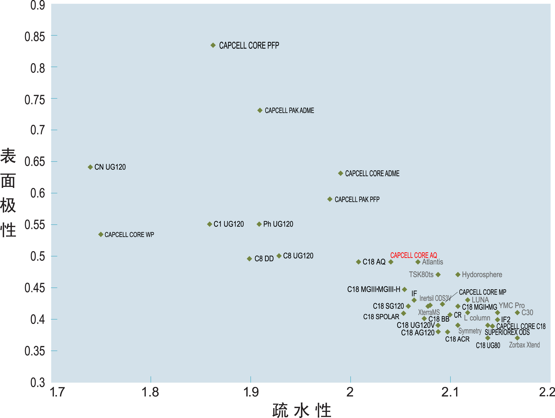 可以在100%水系流动相中稳定使用的核-壳型快速分析柱,并拥有与其他反相色谱柱不同的分离选择特性。