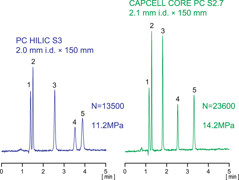 因此,CAPCELL CORE PC S2.7是分析强亲水性化合物的专用核-壳型HILIC色谱柱。