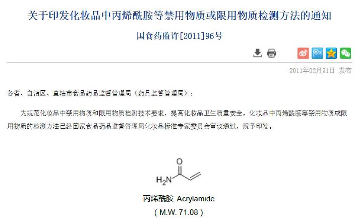 其实,在化妆品中丙烯酰胺单体也属于需要被监测的禁限用物质。