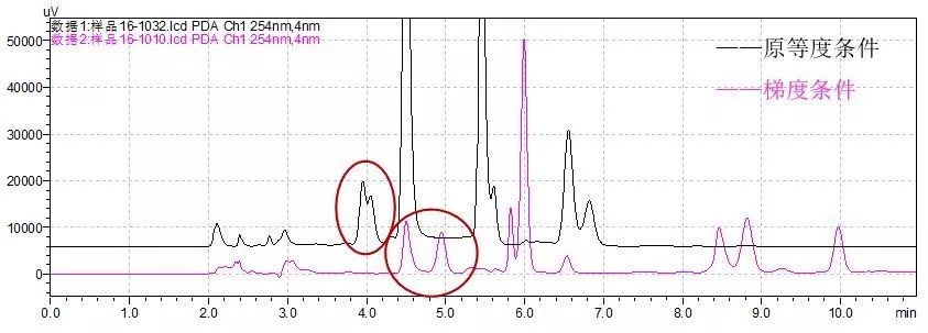 基于个别样品分析时遇到的CMP与其前杂质未得到良好分离的情况,通过对洗脱条件进行调整,可实现CMP与其前杂之间的良好分离。