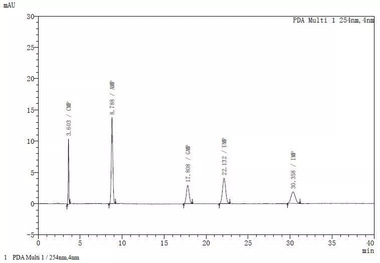 核苷酸是一类由嘌呤碱或嘧啶碱、核糖或脱氧核糖以及磷酸三种物质组成的化合物。根据碱基的不同,分别有胞嘧啶核苷酸(CMP)、腺嘌呤核苷酸(AMP)、尿嘧啶核苷酸(UMP)、鸟嘌呤核苷酸(GMP)及次黄嘌呤核苷酸(IMP)等。由于核苷酸类化合物的极性较强,在常规反相C18色谱柱上难以保留,通常通过添加离子对试剂等方式增强保留。