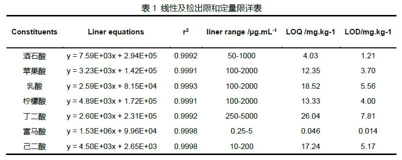 依据国标方法对标准曲线进行绘制。如图3~9所示,酒石酸、苹果酸、乳酸、柠檬酸、丁二酸、富马酸和己二酸在标曲浓度范围内均得到良好线性,相关系数R2均在0.999以上(见表1),符合国标中检量线和定量限要求。