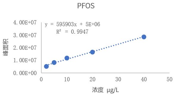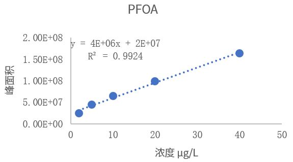 线性考察结果如图2所示,PFOS及PFOA在2 µg/L-40 µg/L浓度范围内线性良好,相关系数r均大于0.99。