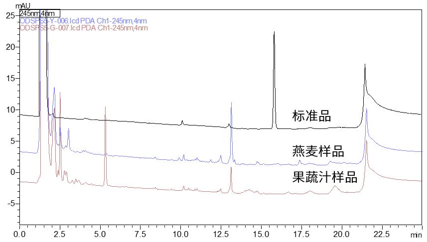 按照标准方法,对燕麦和果蔬汁样品进行前处理,获得结果如图6所示,样品中未检出明显抗坏血酸棕榈酸酯峰。