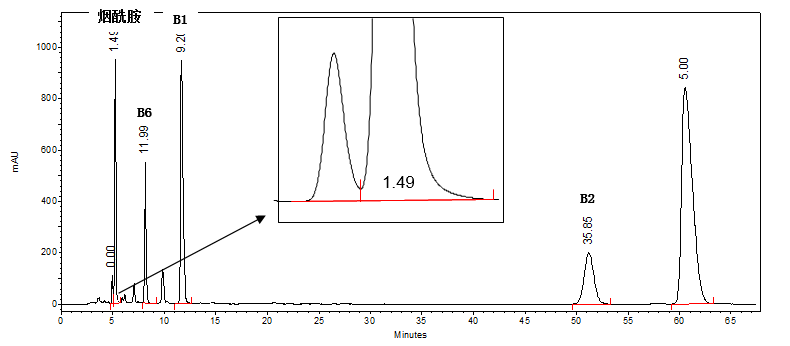 按照客户要求,尝试对五维他口服液中的烟酰胺及其峰前杂质进行分离。